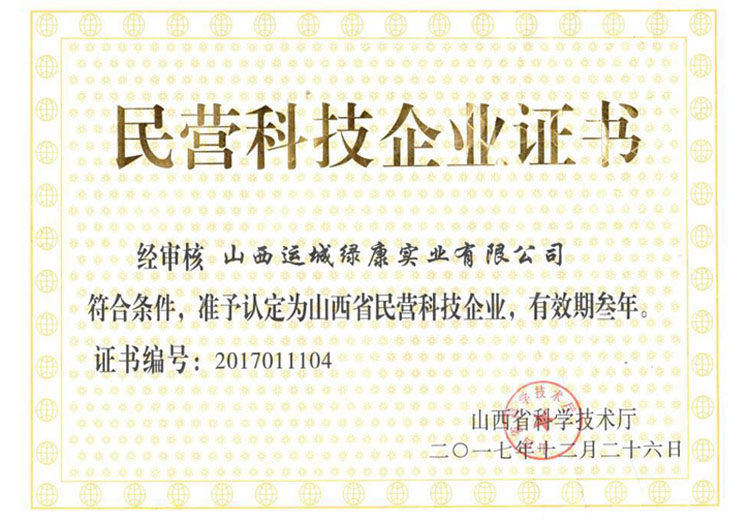山西運(yùn)城綠康實(shí)業(yè)有限公司喜獲省“民營(yíng)科技企業(yè)”證書