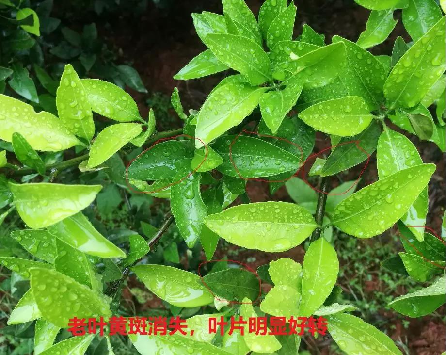 我們建議使用凱露森(2000倍)+黃變綠(1000倍)連續(xù)使用兩次進(jìn)行改善。經(jīng)過兩次使用后觀察,果樹情況大有改觀?!?018年5月8日觀察】