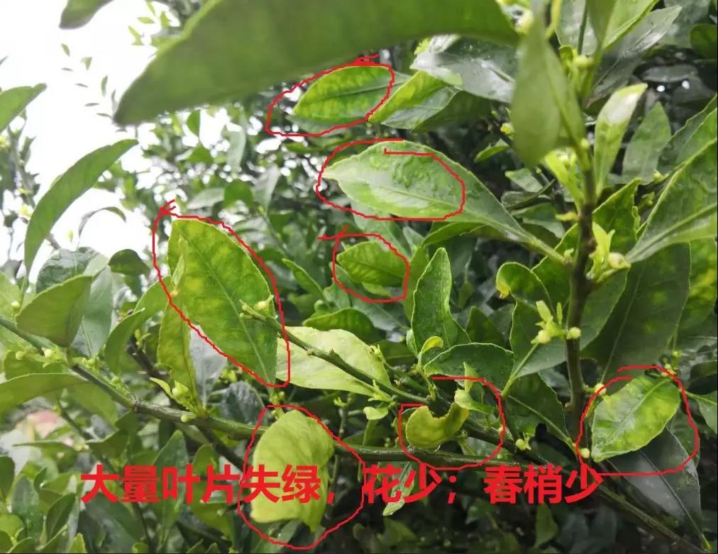 2、2017年收果前使用兩次甜蜜素的果樹--葉片黃、樹勢(shì)弱、花芽少、春梢少。【2018年3月20日觀察】